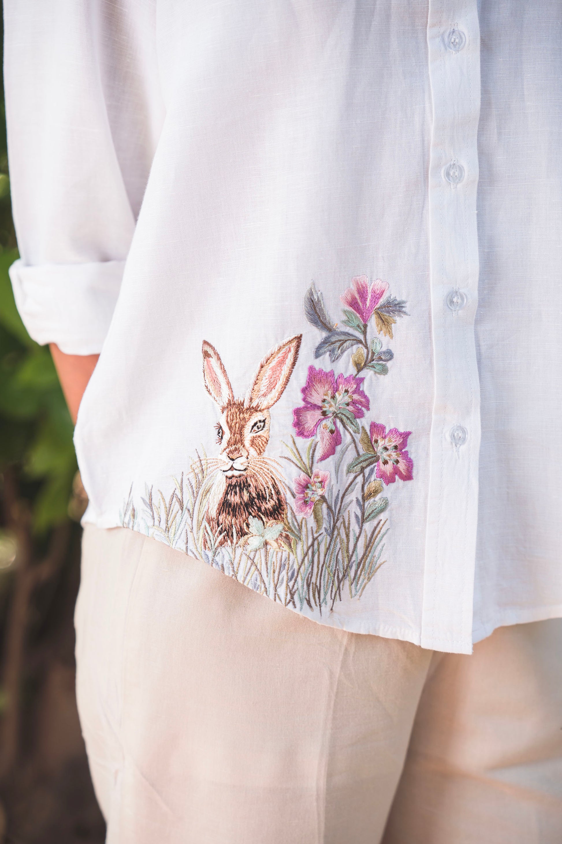 White loose-fitting shirt in cotton linen. Enhanced with a beautiful bunny rabbit and lavender flowers on the left side of the shirt. Full sleeves, can be rolled up as per comfort.